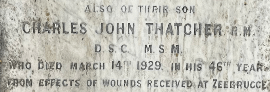 Charles was mentioned in despatches as follows “ Sergt.-Maj. Charles John Thatcher, R.M.L.I. was mainly instrumental in conveying the heavy scaling ladders from the ship [Invincible] to the Mole [The Zeebrugge mole was a mile-long seawall jutting out into the North Sea upon which several German sea-facing artillery guns were placed and had to be taken out for the plan to be a success. It was also studded with concrete machine gun posts] and throughout the operation displayed great coolness and devotion to duty” for which he was awarded the Distinguished Service Cross. I cannot find mention of Charles amongst the injured but when he died 11 years later several regional newspapers reported his death as a “Hero of Zeebrugge” and all the reports mention that Charles was severely wounded and gassed.